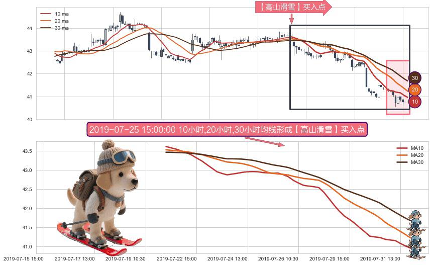 形态多维评估: ⚀ 2019-07-19 15:00:00小时-2019-07-31 15:00:00小时显现 10小时-20小时-30小时均线 【高山滑雪】买入点 看多信号,后市看涨,买入