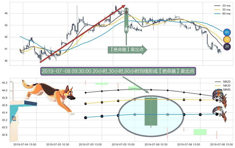 形态多维评估: ⚀ 2019-07-08 09:30:00小时显现 20小时-30小时-60小时均线 【绝命跳】卖出点 看空信号,后市看跌,卖出