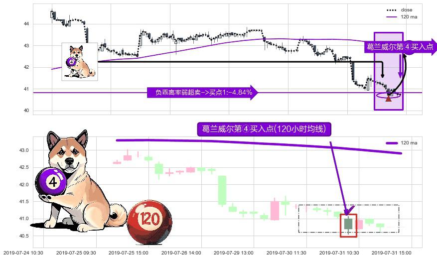 形态多维评估: ⚀ 2019-07-31 09:30:00-小时显现 葛兰威尔均线 120小时均线 第④买入点 下降趋势均值回复的短线反弹信号,后市看涨,买进信号