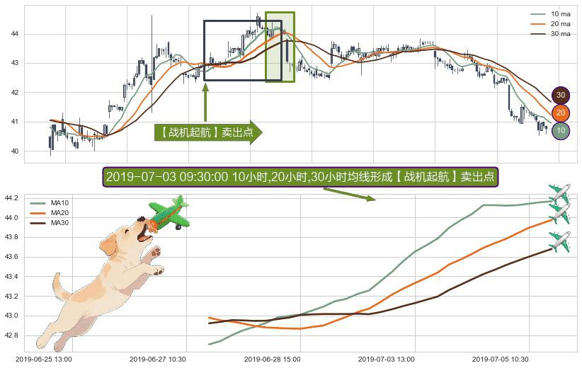 形态多维评估: ⚀ 2019-06-27 13:00:00小时-2019-07-05 13:00:00小时显现 10小时-20小时-30小时均线 【战机起航】卖出点 看空信号,后市看跌,卖出