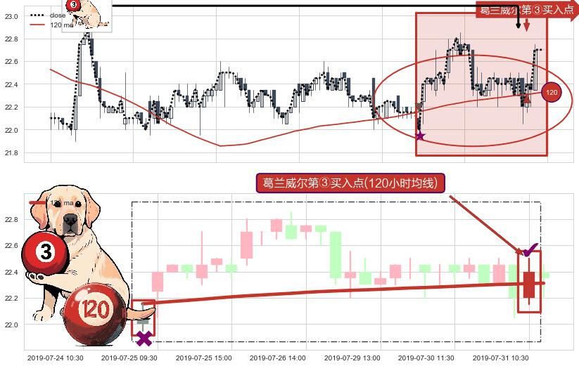 形态多维评估: ⚀ 2019-07-31 10:30:00-小时显现 葛兰威尔均线 120小时均线 第③买入点 上升趋势的中继信号,后市看涨,买进信号