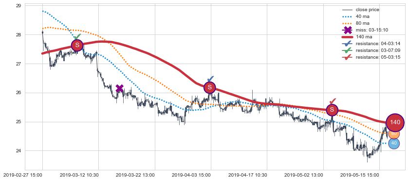 下跌趋势02-27 15:00-05-17 09:30,均线140确认关键阻力3处