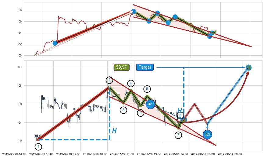 ➢ 最小中继整理涨幅→𝐇: 5.65 (𝐇楔型旗杆的长度:楔型起点→顶点)