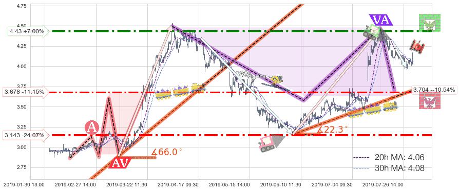 ♘ 阻力价格位4.43,可信任强度75.42%,距离最后交易2019-07-31 15:00形成的收盘价格4.14相差 +7.00%