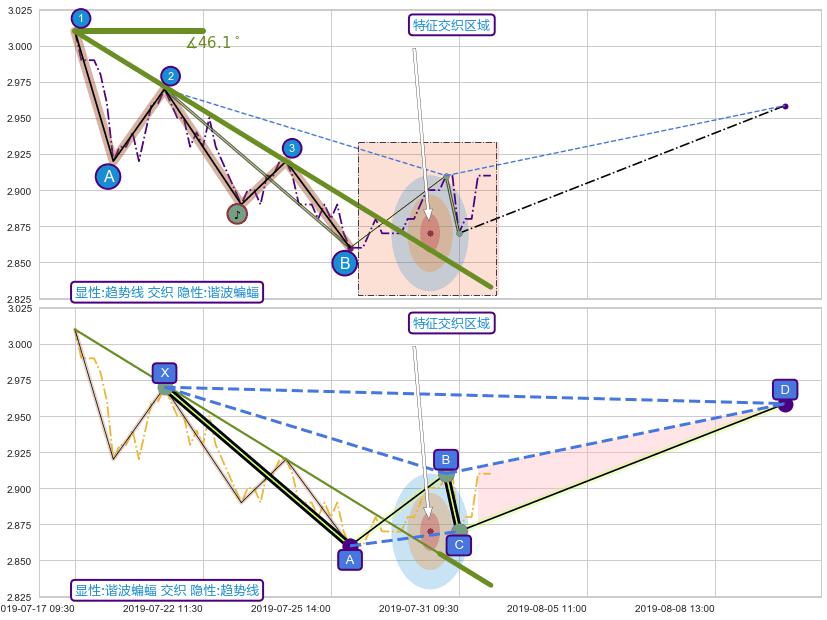 从2019-07-17 09:30至2019-07-30 13:00,共包含58个小时,阶段股价下跌-3.67%,阶段股价变动位移路程比: 1 : 4,下跌趋势角度: 46.1
