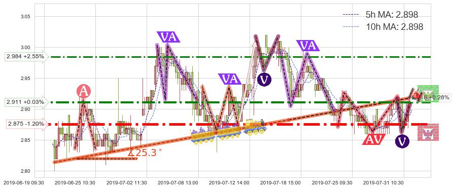 ♘ 阻力价格位2.911,可信任强度75.73%,距离最后交易2019-07-31 15:00形成的收盘价格2.910相差 +0.03%