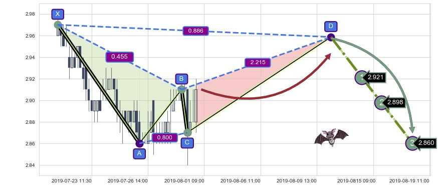 ➣ 未完成【蝙蝠】形态起点X: 07-19:11, 已到达C点: 07-31:09, 预测最终D点: 08-12:12, 共96交易小时