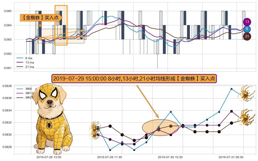 形态多维评估: ⚀ 2019-07-29 15:00:00小时显现 8小时-13小时-21小时均线 【金蜘蛛】买入点 看多信号,后市看涨,买入