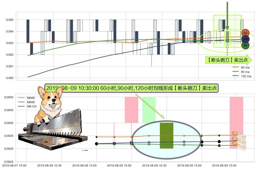 形态多维评估: ⚀ 2019-08-09 10:30:00小时显现 60小时-90小时-120小时均线 【断头铡刀】卖出点 看空信号,后市看跌,卖出