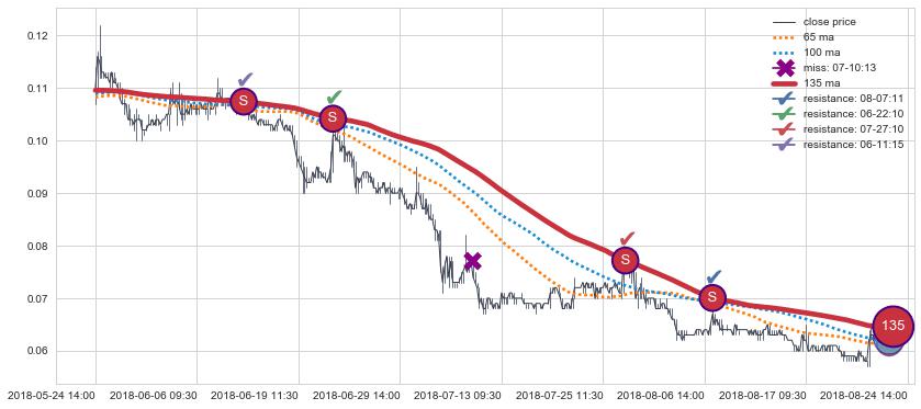 下跌趋势03-21 10:30-06-19 15:00,均线65, 100, 135确认关键阻力4处