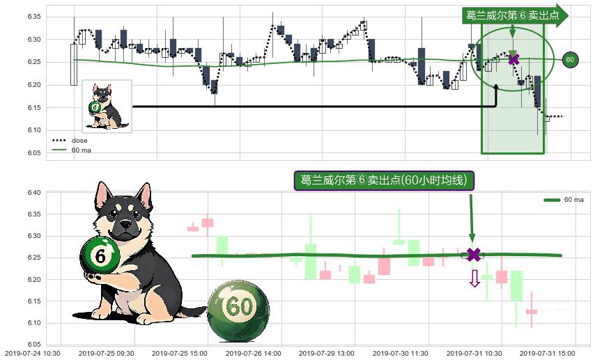 形态多维评估: ⚀ 2019-07-30 15:00:00-小时显现 葛兰威尔均线 60小时均线 第⑥卖出点 走势反转见顶信号,后市看跌,卖出信号