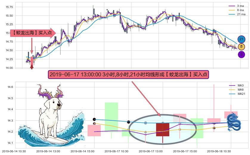形态多维评估: ⚀ 2019-06-17 13:00:00小时显现 3小时-8小时-21小时均线 【蛟龙出海】买入点 看多信号,后市看涨,买入