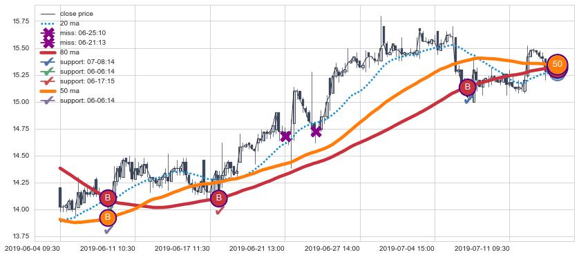 上涨趋势06-04 09:30-07-15 10:30,均线80, 50确认关键支撑3处