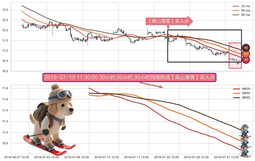 形态多维评估: ⚀ 2019-07-08 15:00:00小时-2019-07-31 15:00:00小时显现 30小时-60小时-90小时均线 【高山滑雪】买入点 看多信号,后市看涨,买入