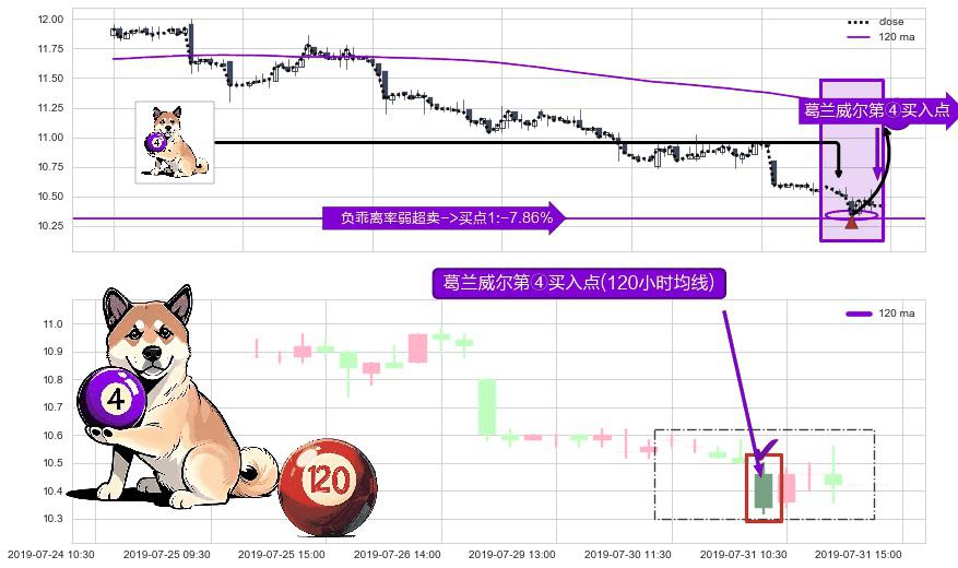 形态多维评估: ⚀ 2019-07-31 09:30:00-小时显现 葛兰威尔均线 120小时均线 第④买入点 下降趋势均值回复的短线反弹信号,后市看涨,买进信号
