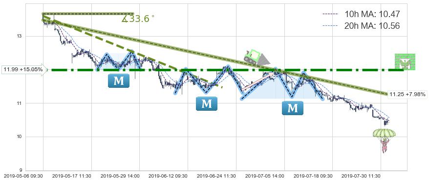 从2019-05-06 09:30至2019-07-31 15:00,共包含360个小时,阶段股价下跌-24.94%,阶段股价变动位移路程比: 1 : 6,下跌趋势角度: 33.6