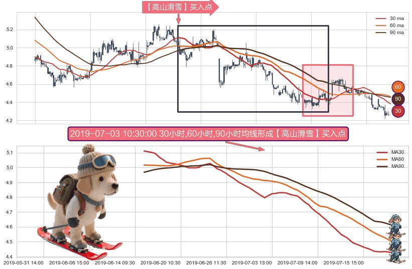形态多维评估: ⚀ 2019-06-14 15:00:00小时-2019-07-18 11:30:00小时显现 30小时-60小时-90小时均线 【高山滑雪】买入点 看多信号,后市看涨,买入