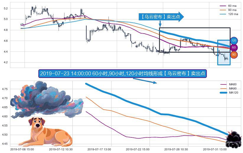 形态多维评估: ⚀ 2019-07-15 11:30:00小时-2019-07-31 15:00:00小时显现 60小时-90小时-120小时均线 【乌云密布】卖出点 看空信号,后市看跌,卖出