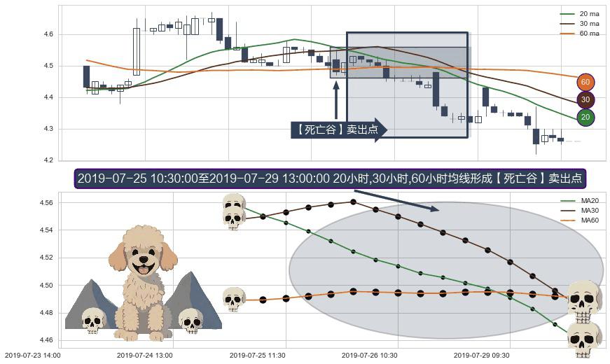 形态多维评估: ⚀ 2019-07-25 11:30:00-小时至2019-07-29 13:00:00-小时显现 20小时-30小时-60小时均线 【死亡谷】卖出点 看空信号,后市看跌,卖出