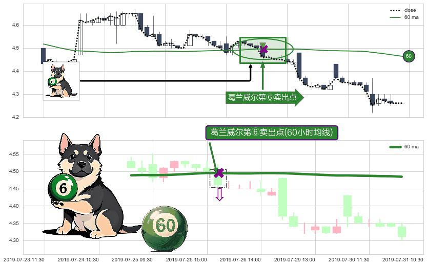 形态多维评估: ⚀ 2019-07-26 09:30:00-小时显现 葛兰威尔均线 60小时均线 第⑥卖出点 走势反转见顶信号,后市看跌,卖出信号