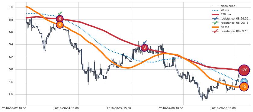 下跌趋势06-24 14:00-07-25 15:00,均线120, 45, 70确认关键阻力2处