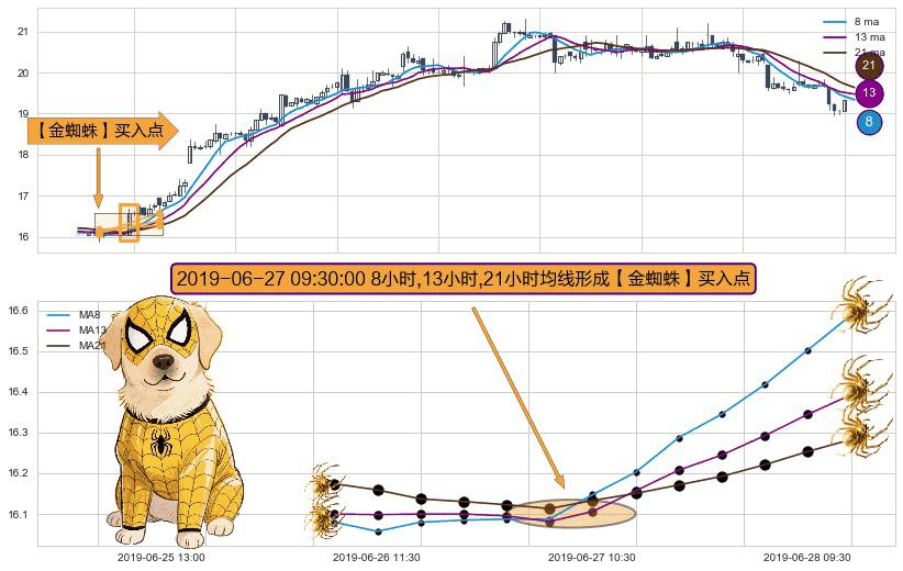 形态多维评估: ⚀ 2019-06-27 09:30:00小时显现 8小时-13小时-21小时均线 【金蜘蛛】买入点 看多信号,后市看涨,买入