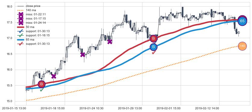 上涨趋势06-10 13:00-07-26 14:00,均线65, 140确认关键支撑3处