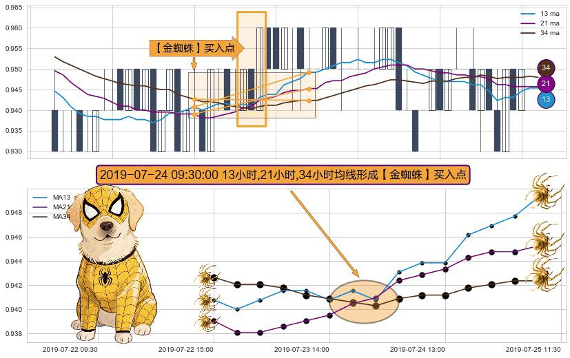 形态多维评估: ⚀ 2019-07-24 09:30:00小时显现 13小时-21小时-34小时均线 【金蜘蛛】买入点 看多信号,后市看涨,买入