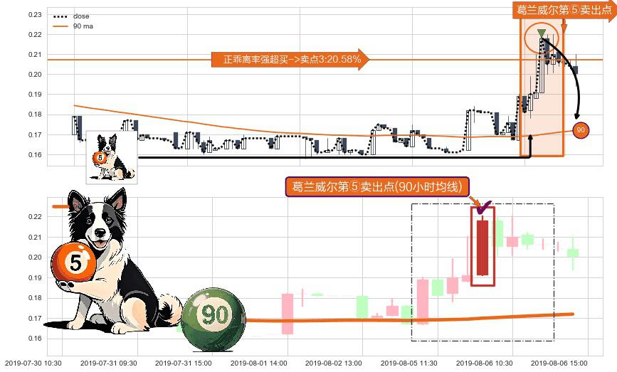 ⚀ 2019-08-05 15:00:00-小时显现 葛兰威尔均线 90小时均线 第⑤卖出点 上升趋势均值回复的短线回落信号,后市看跌,卖出信号