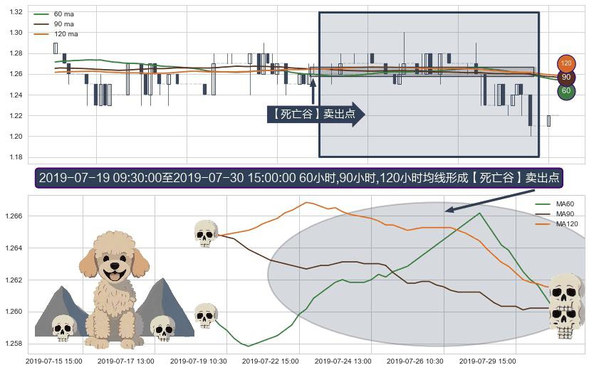 形态多维评估: ⚀ 2019-07-19 10:30:00-小时至2019-07-30 15:00:00-小时显现 60小时-90小时-120小时均线 【死亡谷】卖出点 看空信号,后市看跌,卖出