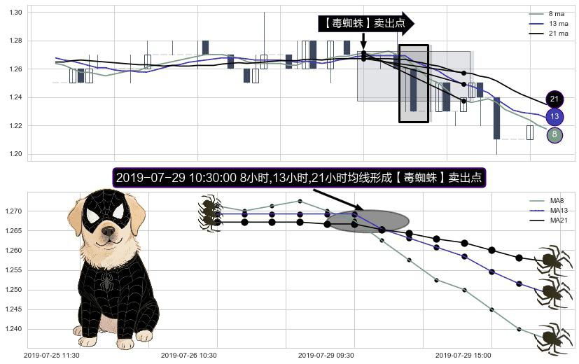 形态多维评估: ⚀ 2019-07-29 10:30:00小时显现 8小时-13小时-21小时均线 【毒蜘蛛】卖出点 看空信号,后市看跌,卖出