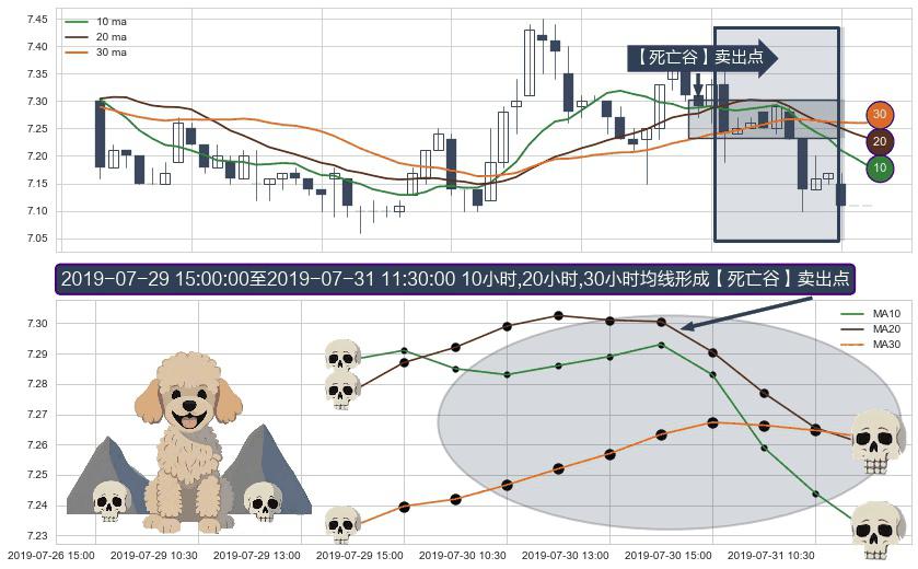 ⚀ 2019-07-30 09:30:00-小时至2019-07-31 11:30:00-小时显现 10小时-20小时-30小时均线 【死亡谷】卖出点 看空信号,后市看跌,卖出