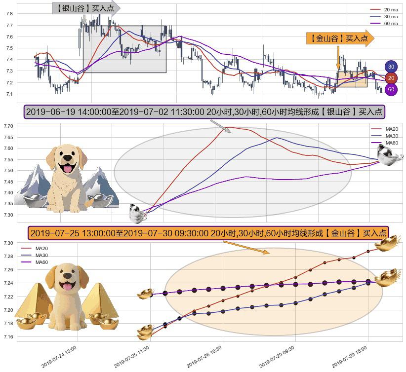⚃ 2019-07-25 14:00:00-小时至2019-07-30 09:30:00-小时显现 20小时-30小时-60小时均线 【金山谷】买入点 其再次确认了买入信号,可靠性更强,买入