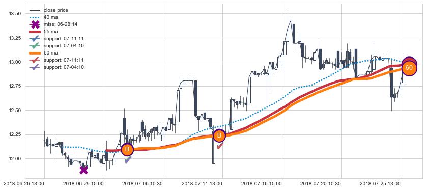 上涨趋势06-26 13:00-07-25 14:00,均线60, 55确认关键支撑2处