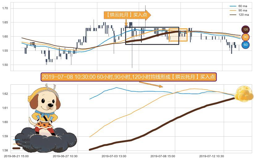 形态多维评估: ⚀ 2019-06-28 09:30:00小时-2019-07-15 11:30:00小时显现 60小时-90小时-120小时均线 【烘云托月】买入点 看多信号,后市看涨,买入