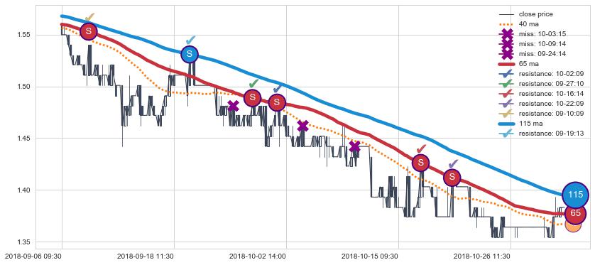 下跌趋势04-23 10:30-06-14 09:30,均线65, 115确认关键阻力3处