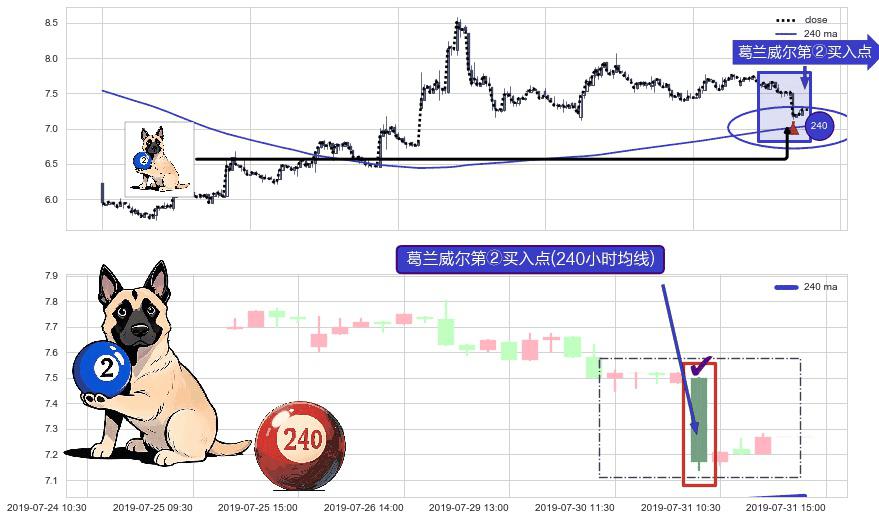 形态多维评估: ⚀ 2019-07-31 09:30:00-小时显现 葛兰威尔均线 240小时均线 第②买入点 上升趋势的中继信号,后市看涨,买进信号