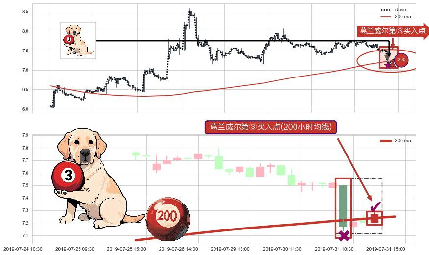 形态多维评估: ⚀ 2019-07-31 13:00:00-小时显现 葛兰威尔均线 200小时均线 第③买入点 上升趋势的中继信号,后市看涨,买进信号