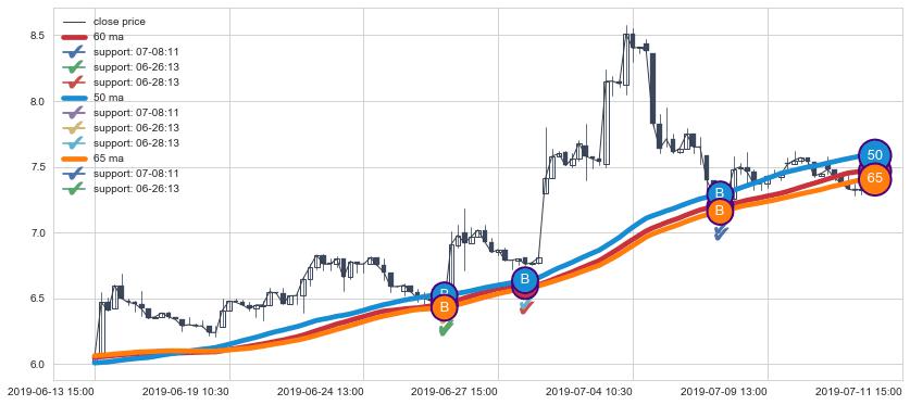 上涨趋势06-13 15:00-07-11 15:00,均线65, 50, 60确认关键支撑3处