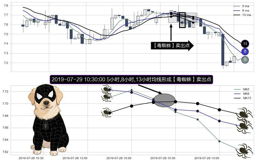 形态多维评估: ⚀ 2019-07-29 10:30:00小时显现 5小时-8小时-13小时均线 【毒蜘蛛】卖出点 看空信号,后市看跌,卖出