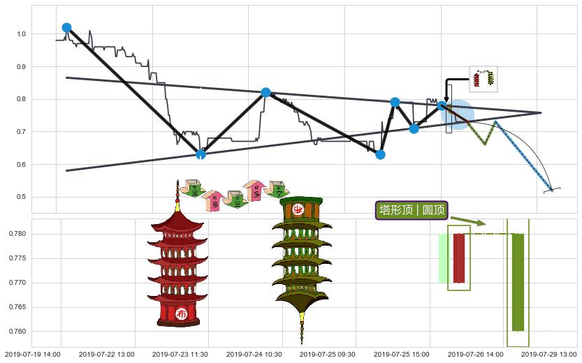 | 3 🅚:下跌两颗星 | 下跌三颗星 ➕ 📐:下降对称三角整理猜想突破点临近,临近关键支撑位,预期下沉突破下跌 ☞ 看空信号 ⇥ 【🅚线】交织【图形】⇥ 综合量化分数: 38 | > |