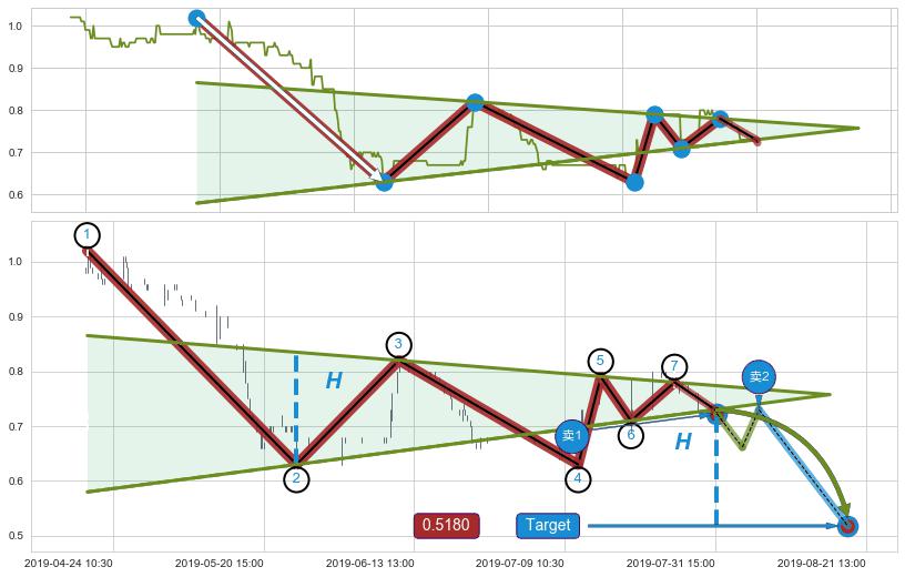 ➢ 最小中继整理跌幅→𝐇: 0.204863 (低点逐步抬高斜边第一支撑点②与阻力边垂直距离)