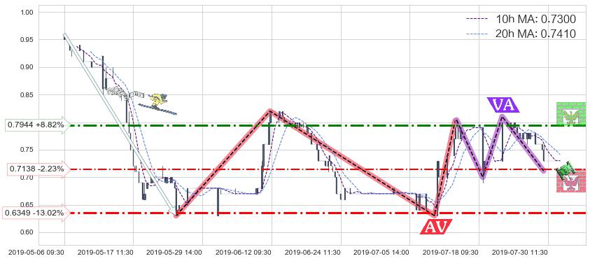 从2019-07-15 11:30至2019-07-31 15:00,共包含76个小时,阶段股价下跌-6.64%,阶段股价变动位移路程比: 1 : 7