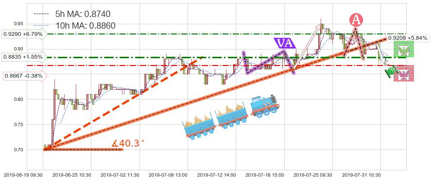 ✂️ 2019-06-19 10:30-2019-07-25 15:00上升趋势存在反转[风险],其原上升趋势的支撑位(0.9208)已破位[强阻力信号],原上升趋势角度: 40.3˚