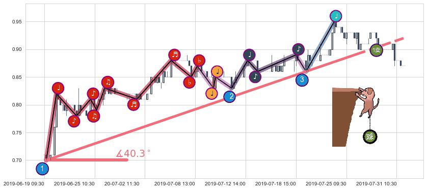 从2019-06-19 10:30至2019-07-09 15:00,共包含83个小时,阶段股价上涨20.48%,阶段股价变动位移路程比: 1 : 3,上涨趋势角度: 56.8