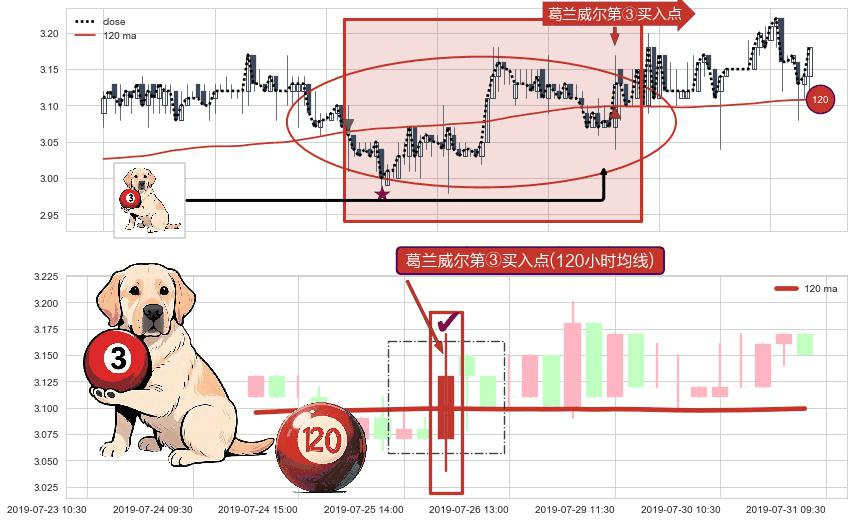 形态多维评估: ⚀ 2019-07-26 09:30:00-小时显现 葛兰威尔均线 120小时均线 第③买入点 上升趋势的中继信号,后市看涨,买进信号