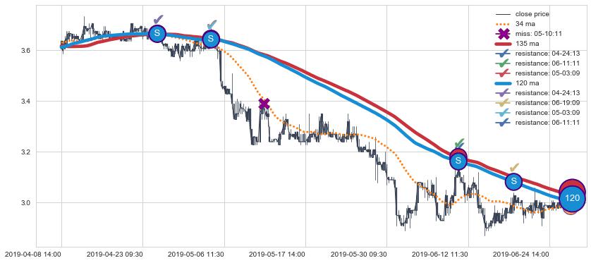 下跌趋势04-08 14:00-06-25 15:00,均线120, 135确认关键阻力4处