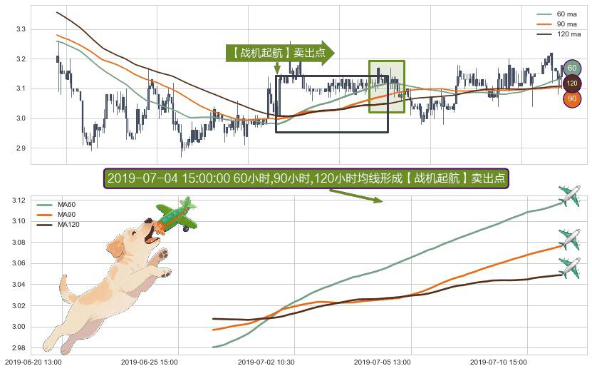 形态多维评估: ⚀ 2019-06-26 15:00:00小时-2019-07-11 15:00:00小时显现 60小时-90小时-120小时均线 【战机起航】卖出点 看空信号,后市看跌,卖出