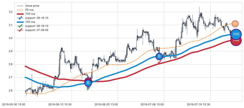 上涨趋势05-30 15:00-07-25 09:30,均线144, 105确认关键支撑2处