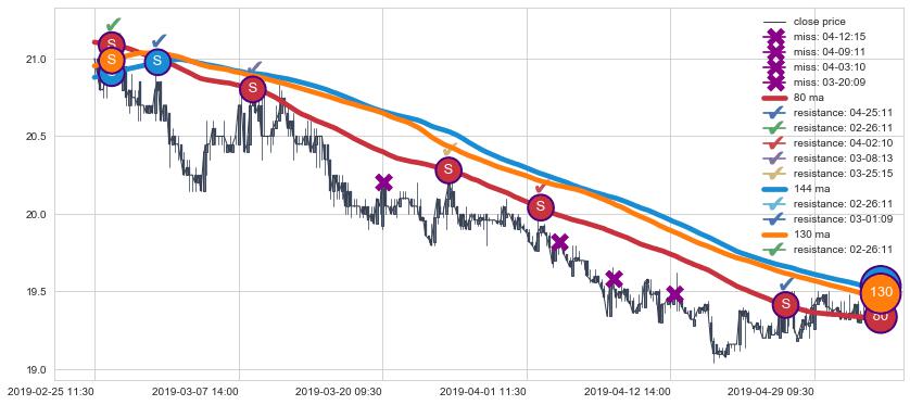 下跌趋势02-25 11:30-05-02 15:00,均线80, 130, 144确认关键阻力6处